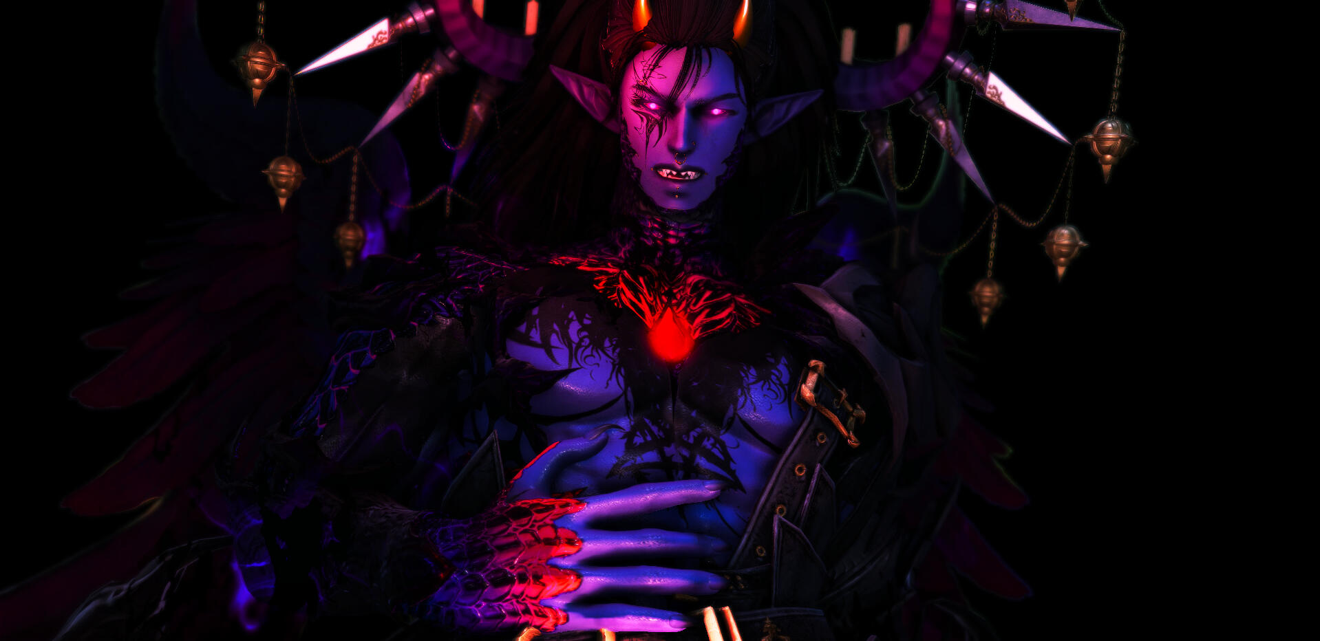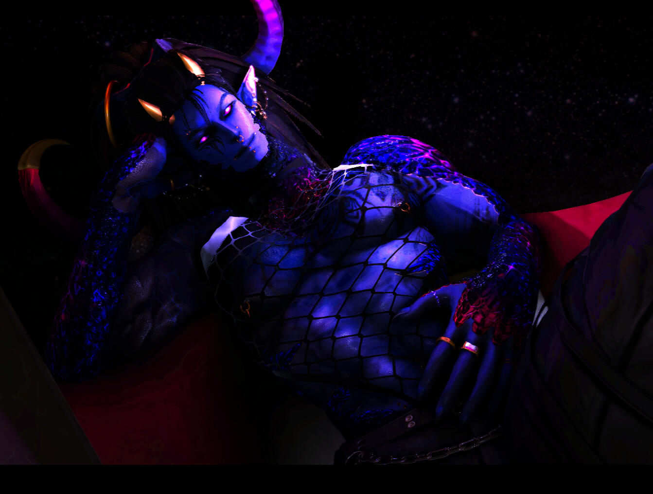 A towering arch-demon who melts the moment someone takes the lead. Known for his molten warmth, voidal glow, and himbo charm, he’s a submissive who thrives on playful command and confident hands. Despite his fearsome title as Wargod, he kneels with eager obedience, his deep rumbling voice giving away every ounce of anticipation he tries to hide. For all his size and power, Heed carries himself with a delicious, teasing submission… the kind that dares you to take control. Heed’s kinks are a blend of feral instinct and devoted obedience.Sexuality: Pansexual